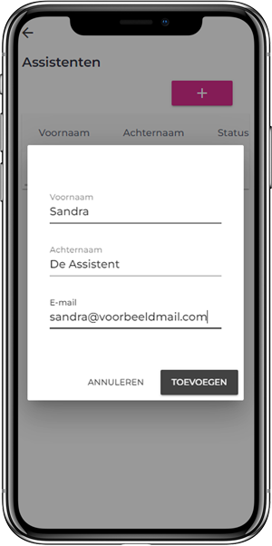 Open de app en kies voor “assistenten”. Daar geef je de naam en het emailadres van jouw assistent op.