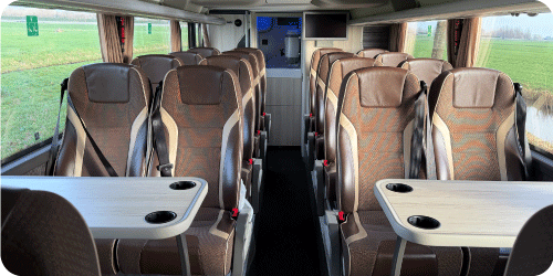 De luxe touringcar voor 74 personen is uitgerust met alle luxe voorzieningen die je kan bedenken.